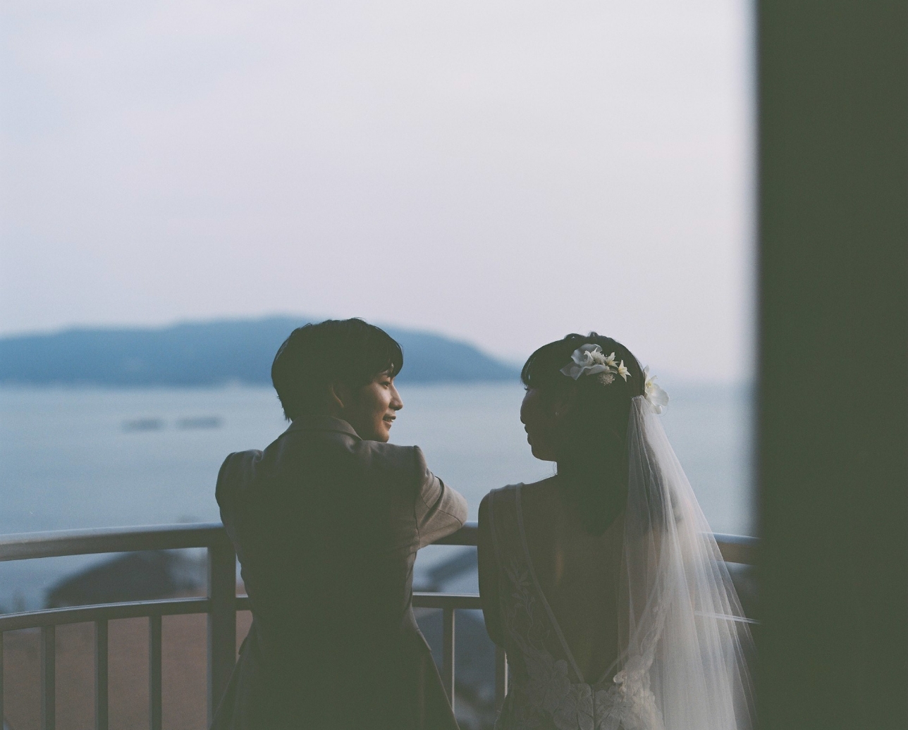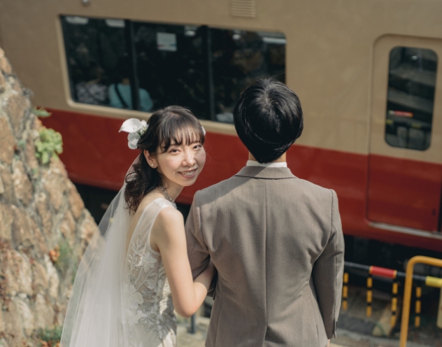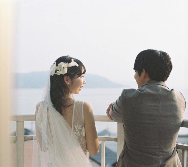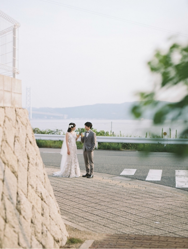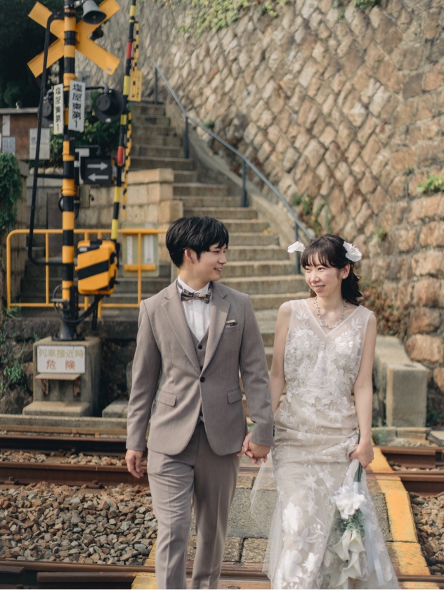 思い出の街「塩屋」では、踏切での撮影や、どこか懐かしさを感じるレトロな雰囲気の中で過ごすひとときも。そして、瀬戸内海を望むご自宅では、ゆったりとした時間に包まれながらの撮影となりました。