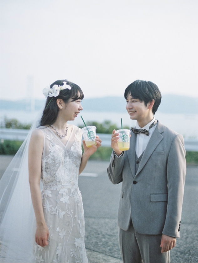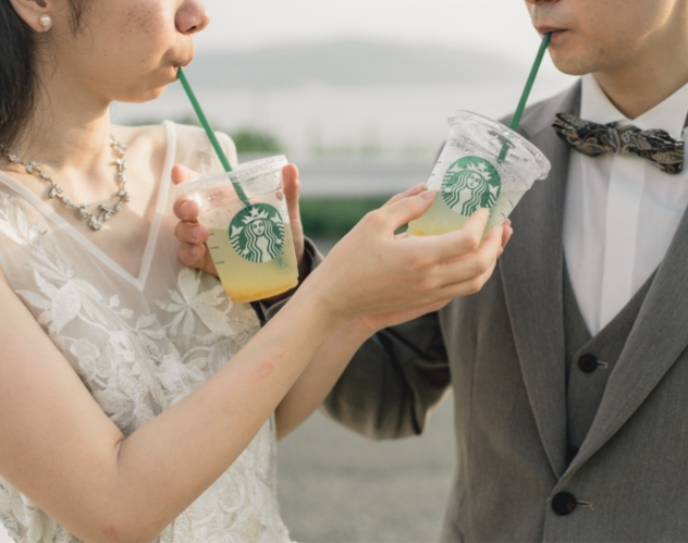 撮影中には、おふたりが「今日のために我慢してきた」という大好きなスタバを手に、幸せそうに乾杯。